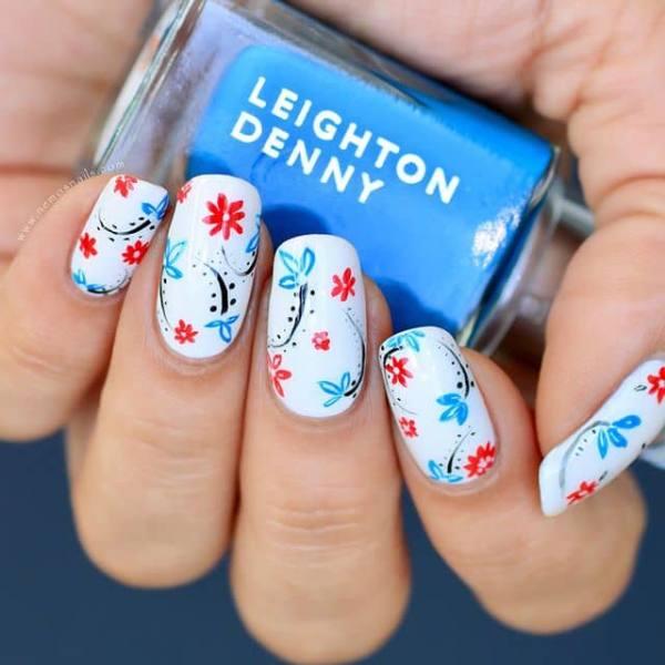 Este diseño es genial para aquellos que buscan algo que puedan pintar en las uñas naturales. Con una base blanca brillante, estas juguetonas flores rojas y blancas en picada crean un divertido y atractivo aspecto primaveral. Genial para el uso diario o para una fiesta primaveral, puedes vestir fácilmente estas uñas con un vestido de sol o con un pantalón vaquero y una T.