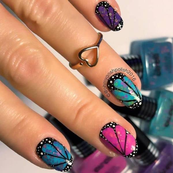 Con la abundancia de arte de uñas que ha surgido en los últimos años, encontrar un diseño verdaderamente original puede ser un desafío. Esta muy interesante superposición de pétalos de flores translúcidas sobre lunares blancos en una uña negra es algo raramente visto. Con cada uña de un color diferente, el diseño es juguetonamente variado.
