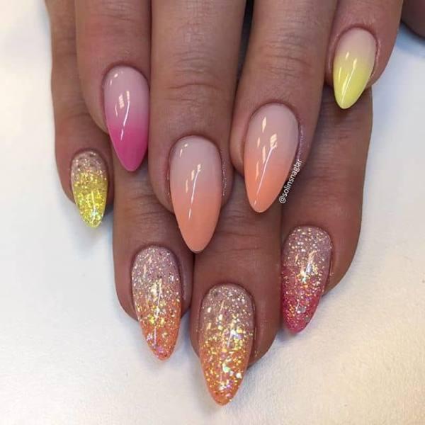 22. ¡Un ombré de melocotón con mucha chispa, una idea de uñas muy moderna y hermosa!
