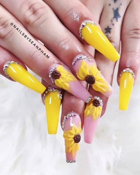 Nada sacude más el sueño y la tristeza del frío invernal que un ramo de flores frescas. Tanto si tienes un ramo en casa como si no, estas soleadas y brillantes uñas son el perfecto estímulo para pasar de días cortos a largos. El borde de piedras de imitación a lo largo del borde añade aún más brillo a un aspecto que ya brilla.