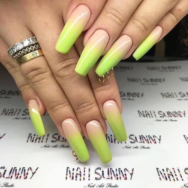 La temporada de primavera siempre se ha asociado con el color verde. La nueva vida que brota por todas partes es una gran elección cuando buscas un color que represente la época del año en tus uñas. Este look se desvanece de un desnudo a un verde y presenta unos anillos de uñas súper geniales en un dedo para un pop divertido.