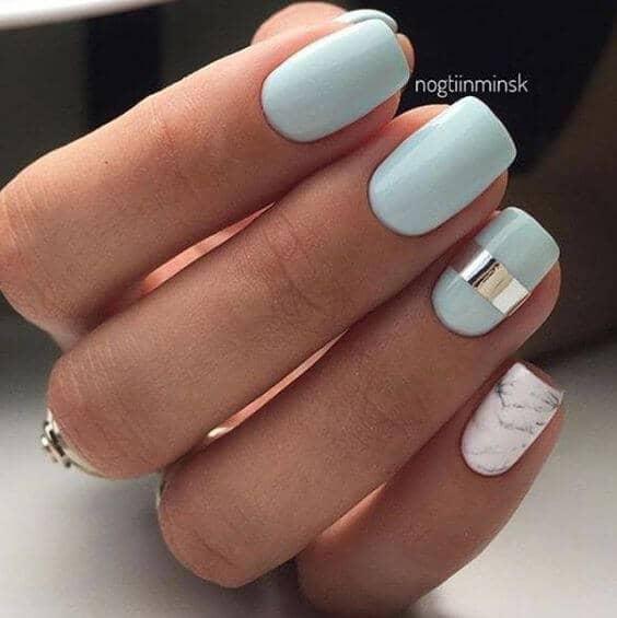 p>Si estás buscando incorporar tu estilo fresco y vanguardista en un look de uñas que esté a punto para la primavera, este diseño es una gran manera de hacerlo. Con una banda plateada y una uña con acento en mármol, hay un elemento de vanguardia, pero con un encantador color azul claro de petirrojo, incorpora sin problemas la facilidad de la primavera.