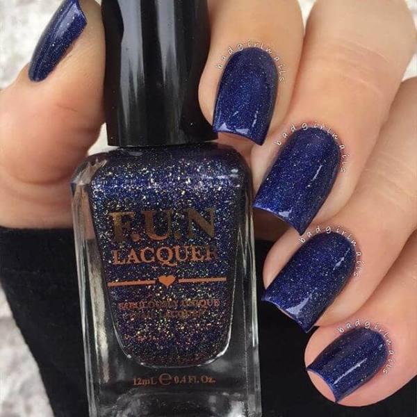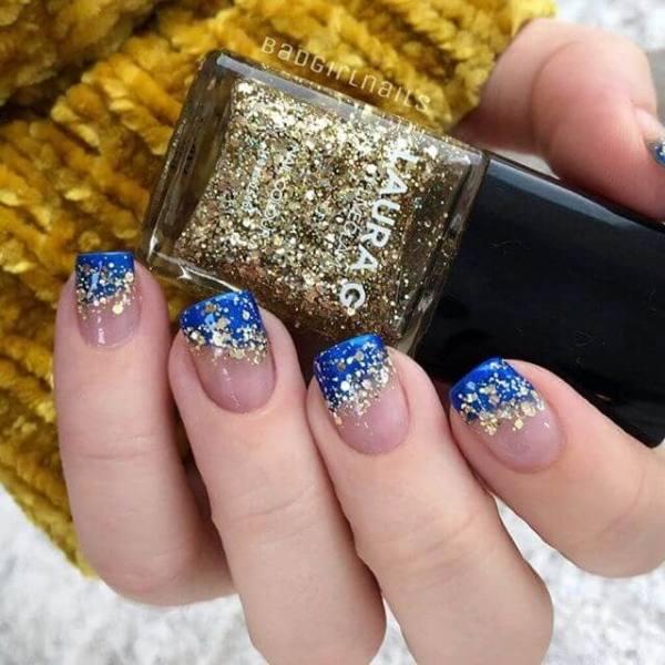 Este diseño esconde la línea clara que divide el pulido claro del azul brillante usando motas y destellos de un hermoso pulido de confeti dorado. Este mágico empolvamiento de polvo de hadas no sólo hace más suave la transición del azul al claro, sino que también añade un elemento de capricho y juerga. El azul y el oro son una clásica y fiable combinación magnífica.