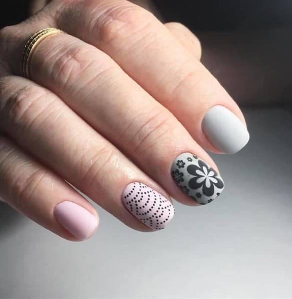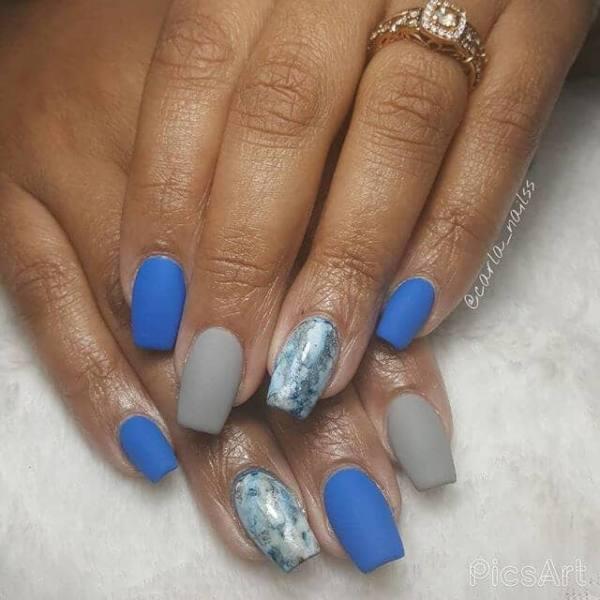El gris y el azul siempre han sido una combinación natural. Ambos tienen una cualidad genial y se mezclan sin esfuerzo el uno con el otro. Estas uñas combinan un azul brillante con un gris acerado que, aunque están separadas por muchas sombras, se casan bien. Como acento, incorporan una magnífica uña azul plateado jaspeada que une todo el paquete.