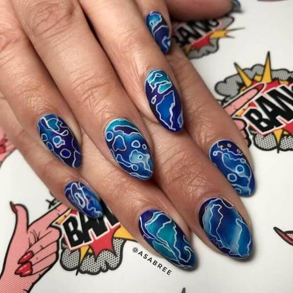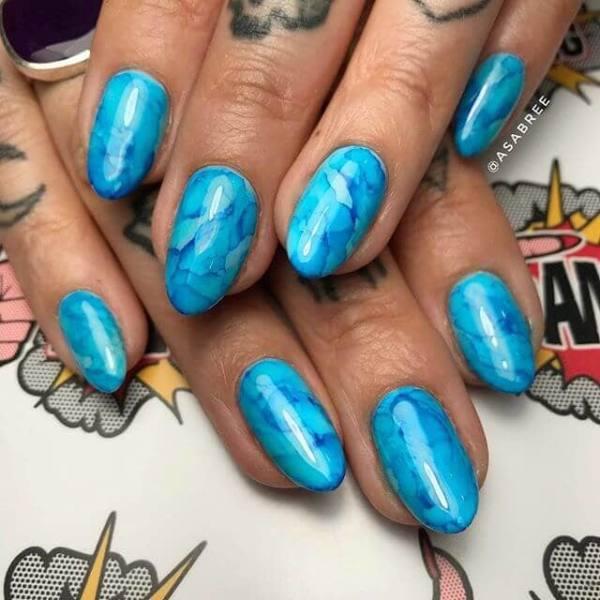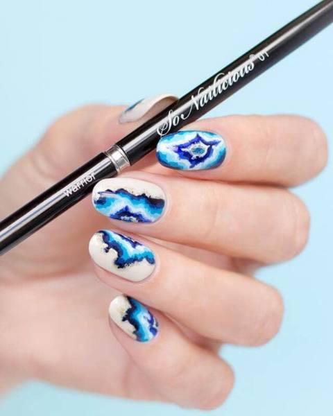 Estas uñas de color azul claro tienen venas de color azul oscuro que se asemejan tanto a las líneas de tinta húmeda como a las placas de piedra marmórea. Sin embargo, al ver estas uñas, su variedad de tono y profundidad crean un interesante aspecto agrietado que es lo suficientemente simple para el día a día pero lo suficientemente interesante para una noche de fiesta.