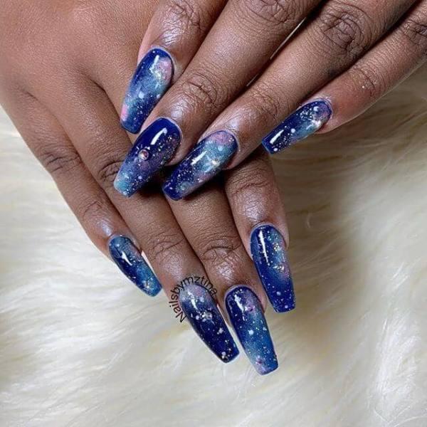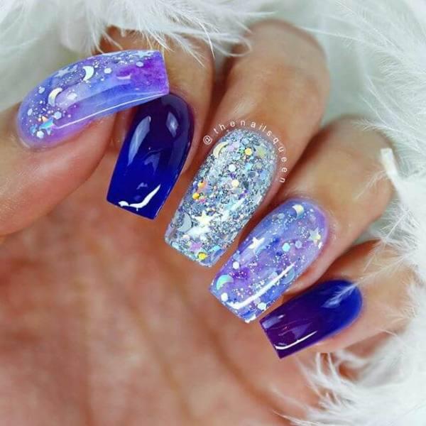 Si tus ideas de uñas azules son para un evento próximo fuera de este mundo, entonces estas uñas son la elección correcta para ti. Este arte de uñas azules presenta una uña media que está repleta de destellos, dos uñas más moderadas que tienen algunos destellos pero también algún colorido sólido que se muestra a través de ellas, y dos que están suavemente coloreadas para capturar los mejores matices del cielo nocturno.