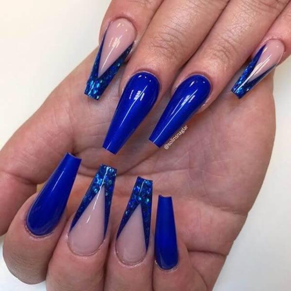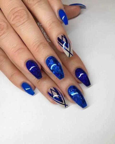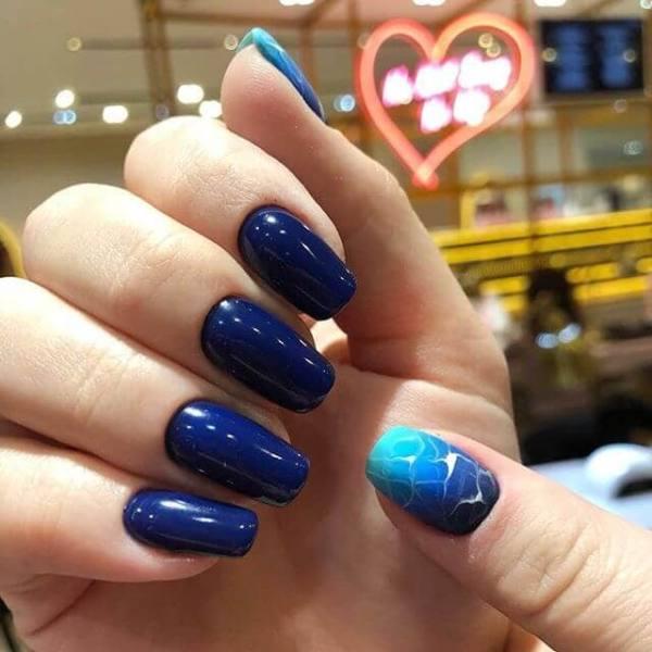 Después de haber estado pensando en diseños de uñas azules todo el día, seguramente se le ocurrirán grandes ideas. El problema entonces se convierte en cómo incorporarlas todas. Con un aspecto como este, puedes mostrar dos diseños de uñas azules impresionantes de una sola vez. El azul es suficiente para unir estos dos conjuntos, que de otra manera no estarían relacionados, para un divertido look de Jekyll y Hyde.
