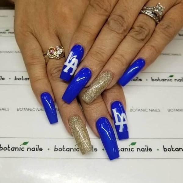 Cuando tu equipo deportivo favorito también presuma de tus colores favoritos, hazlo a lo grande y muestra tu espíritu de equipo con el impresionante arte de las uñas azules. Los Dodgers de Los Ángeles tienen un excelente azul verdadero como color principal. Combina este homenaje con una uña dorada brillante para el espíritu y su raíz, raíz, raíz para el equipo local.