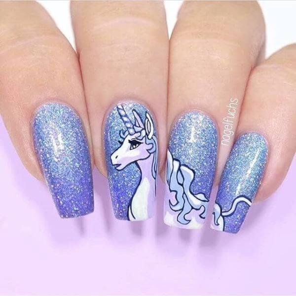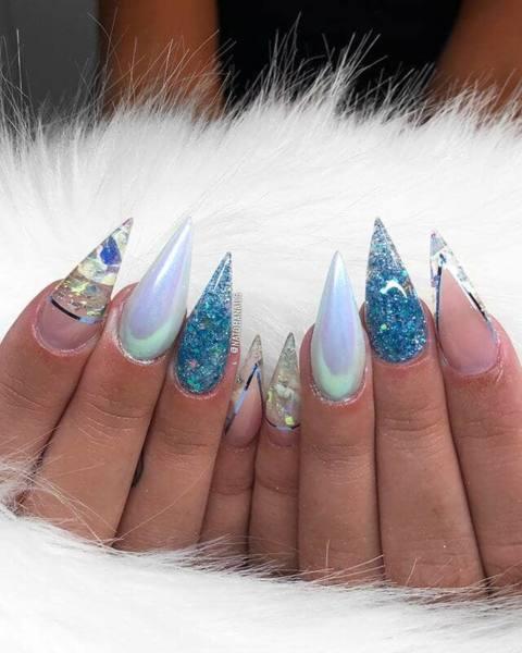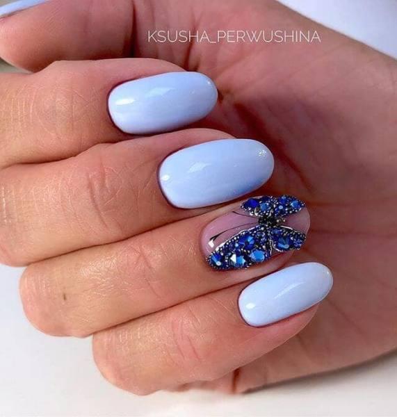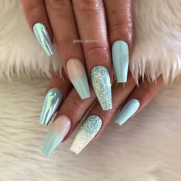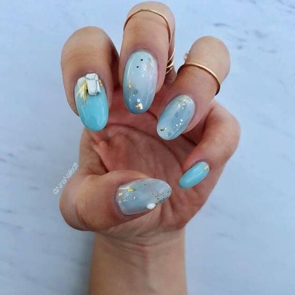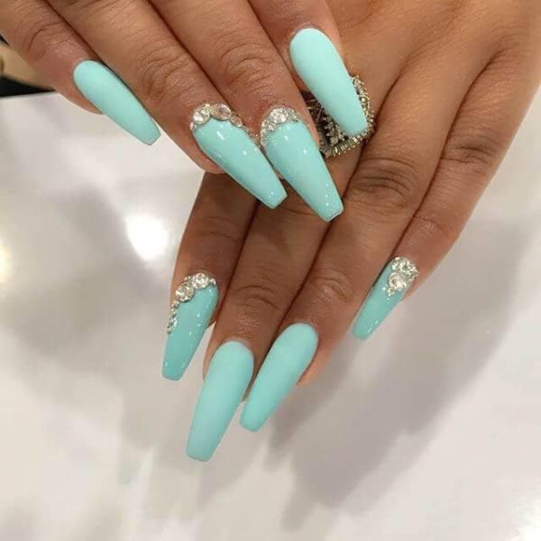 Con su tono mentolado y su brillo helado, estas bonitas uñas son uno de los mejores diseños de uñas azules. Incorporando accesorios divertidos y apropiados, un encantador tono de azul, y sutiles diferencias de textura, estas uñas dan en el blanco para un gran diseño de uñas. La decisión de colocar las brillantes uñas joyas en los dedos opuestos de cada mano es una agradable variación.