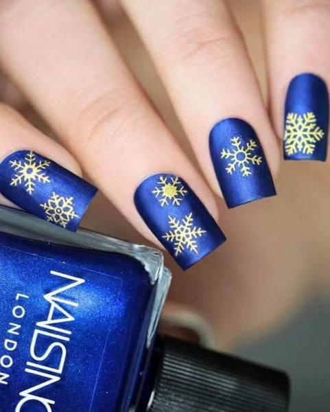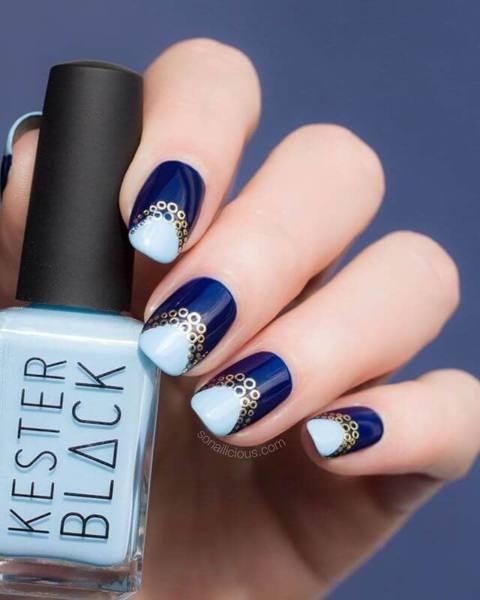 un sutil guiño a la manicura francesa. En lugar de blanco puro, usa un azul muy claro, casi níveo. Y por supuesto, estas uñas renuncian a la base brillante y clara, reemplazándola con una base azul oscuro y artísticos grupos de círculos dorados.