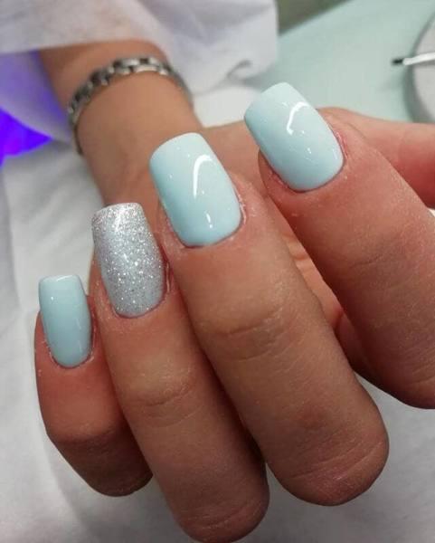 26) Classy Tiffany Blue Nails with Glittery Accent