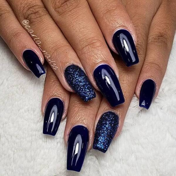 Un azul ultra-oscuro es tan elegante como el negro, pero con un poco más de personalidad. Las ideas de las uñas azules a menudo implican colores brillantes, pero el uso de este azul de medianoche es divino. La uña con acento en el brillo le da a este aspecto serio un toque ligeramente juguetón que es muy adecuado para un evento de gala o una noche de cita elegante.