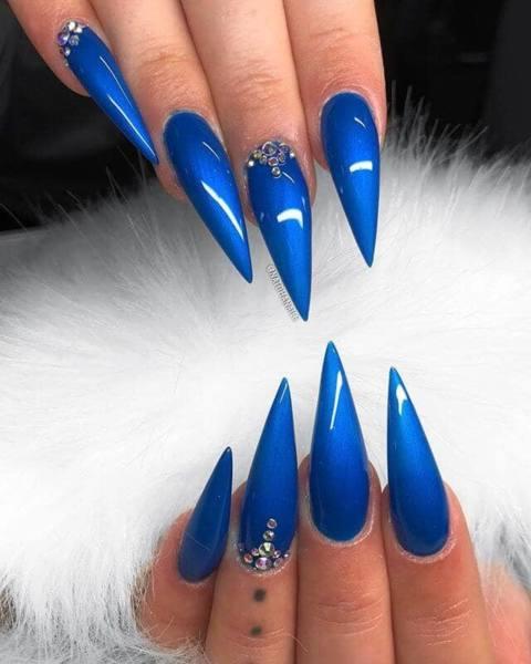 Con un aire de realismo, estas uñas de estilete lisas y brillantes presentan un suave y acogedor tono de cobalto junto con una punta de estilete potente e intensa que puede presentar al portador como una persona amistosa pero sin tonterías. Añade pequeños diamantes de imitación para un toque de clase y brillantez.