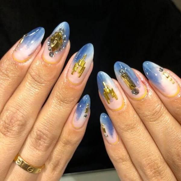 Las magníficas puntas azules de acuarela de estas bonitas uñas crean un magnífico efecto de horizonte. Combínalo con reflejos dorados y brillantes, y obtendrás un aspecto que recuerda a un brillante paisaje urbano. El suave sombreado de las uñas junto con los detalles de metal duro crea un aspecto dinámico y memorable.