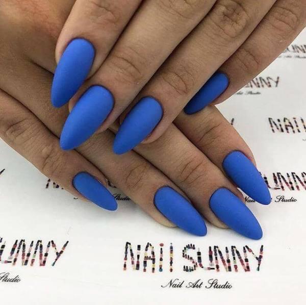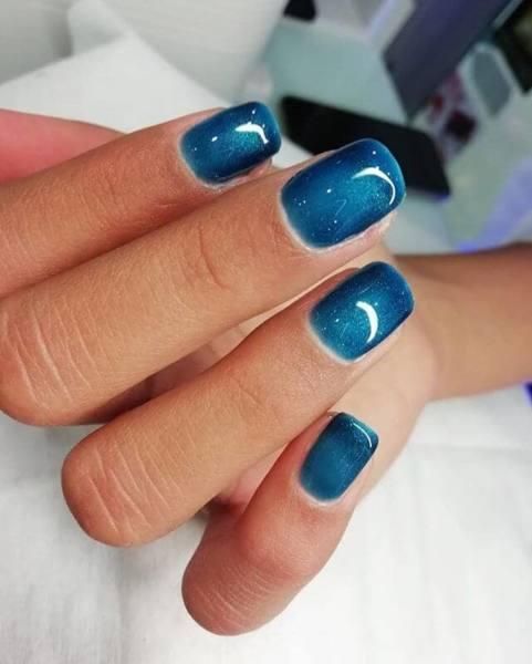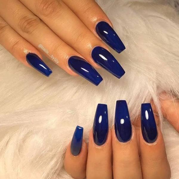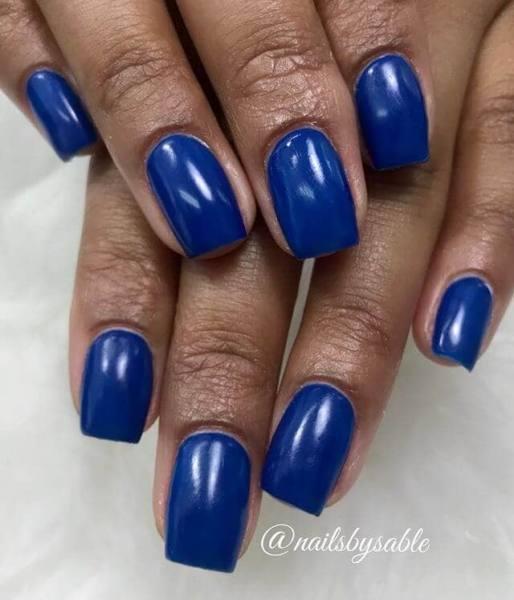 Ya sea que estés apoyando a tu equipo deportivo favorito o simplemente usando tu color favorito, este look súper brillante es una opción divertida y juguetona. El falso brillo crea textura y profundidad, mientras que el azul sólido hace una declaración audaz. Esta es una de las mejores ideas de uñas azules para cualquiera que quiera simplemente mostrar su color favorito.