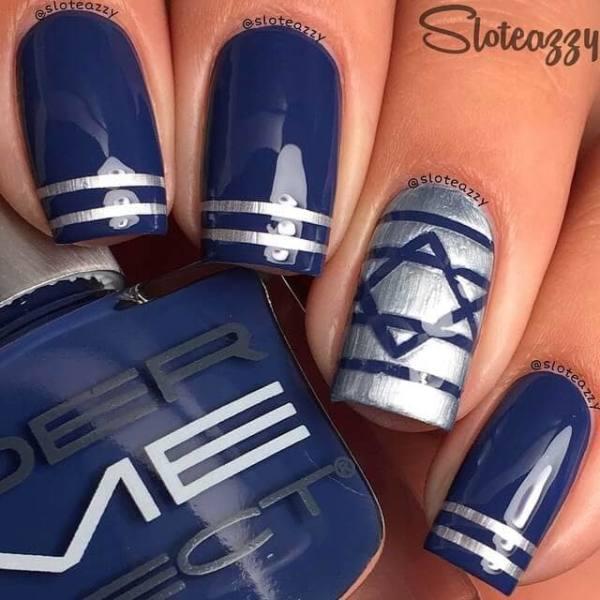 Crear diseños puede parecer intimidante, pero si empiezas con ideas de uñas azules fáciles como esta, puedes cogerle el truco en poco tiempo. Emparejar una plata metálica con este magnífico azul sólido es una gran idea para crear líneas distintivas. Empieza con sólo dos líneas y ve subiendo hasta el intrincado diseño de la uña de acento.