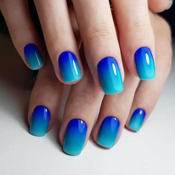 La idea de una uña azul muy bonita es un ombre suave. Esta mirada siempre termina evocando el mar o el cielo, exudando calor y relajación de cualquier manera. Elija los dos azules que le gusten para mezclarlos, y no tenga miedo de experimentar con los colores. Cuanto más separados estén los colores de inicio y final, más dramática será la transición.