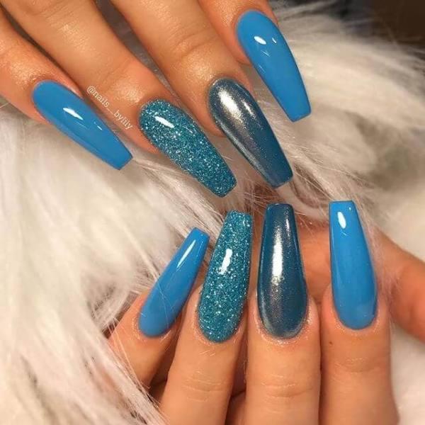 Una de las mejores ideas para los diseños de uñas azules es mantener un tema de color consistente, pero ir alocado con diferentes aplicaciones. Este aspecto lo hace perfectamente. Con una uña metálica, un ombre suave, un aturdidor de brillo y una uña brillante de un solo color, este aspecto es una muestra perfecta de equilibrio, diversión y creatividad.