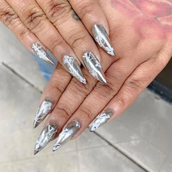 Este es un diseño único de uñas de plata, y hay mucho espacio para la individualidad con este diseño particular. Una capa de plata brillante de esmalte de uñas en cada uña y las puntas están limadas a una punta afilada, lo que les da un aspecto bastante fresco. En la parte superior del esmalte plateado, hay diferentes flores blancas que añaden carácter al diseño individual de cada uña.