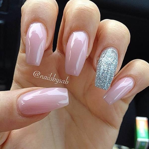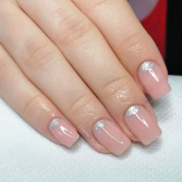 Este es un elegante diseño de uñas que puede ser usado en múltiples ocasiones, y está destinado a revelar el lado bueno de su personalidad. Este diseño utiliza una capa base de esmalte de uñas de color rosa pálido y brillante, y las puntas se rocían con plata y brillo alegre. Este es un diseño práctico que utiliza puntas cuadradas, pero está cortado más corto, por lo que puede ser utilizado tanto para ocasiones formales como casuales.