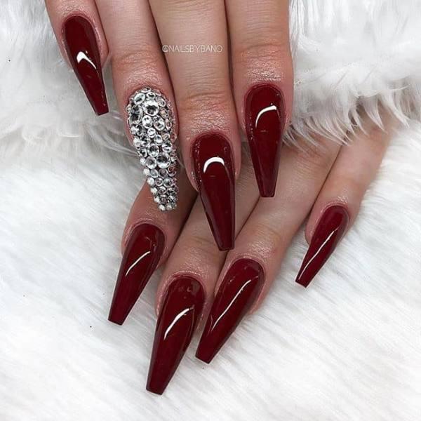 Este es un diseño de uñas impresionante que proporciona al usuario una opción fácil pero elegante para las uñas básicas, y este diseño utiliza dos tipos de cortes de punta. Debido a la longitud, las uñas se extienden y adelgazan como un corte de lágrima, pero la punta misma de las uñas son cuadradas, y todos los dedos están cubiertos de un rojo oscuro pero brillante, excepto un dedo de cada mano. Esa uña está cubierta con piedras preciosas de plata que llamarán la atención de los demás en la habitación.