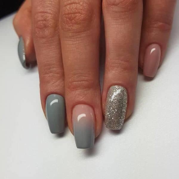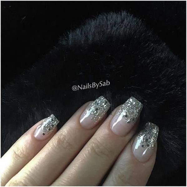 Este diseño de uñas proporciona un aspecto más natural, mientras que sigue mostrando su fabuloso lado brillante. El esmalte de uñas de la base es de un color de aspecto natural, y cada punta tiene la forma de un cuadrado pintado con esmalte de uñas plateado brillante con grandes motas atadas a lo largo para dar una sensación aleatoria al diseño.