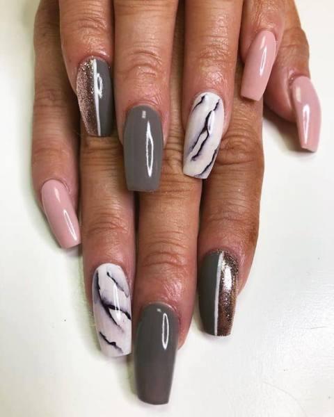 Cada uña de ambas manos tiene un tema diferente. Puedes disfrutar del diseño de las uñas de color rosa pálido en algunas uñas, mientras que otras uñas tienen un color plateado recto. Una uña de cada mano está cubierta con esmalte de uñas blanco y se remueve con esmalte negro para dar la ilusión de mármol. También hay otro punta que ata todas las uñas juntas pintando la mitad con la plata y la otra mitad con un brillo dorado rosado.