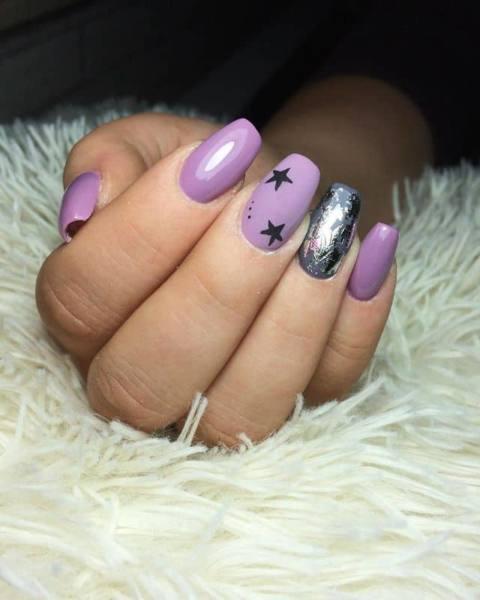 Este es un diseño de arte de uñas muy general y simple. Funciona bien con cualquiera que lo use. La base del tema es un púrpura claro y pálido, y un par de estrellas negras en la uña, junto a una uña que usa esmalte metálico plateado salpicado en el esmalte de base púrpura. El diseño utiliza una punta cuadrada ligeramente redondeada.