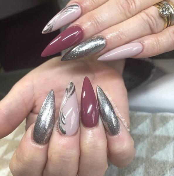 Este diseño de uñas tiene forma de punta, y utiliza una mezcla de esmalte de uñas natural y esmalte de uñas con brillo plateado. Cada uña tiene un diseño ligeramente diferente, mientras que algunas están completamente pintadas con el esmalte natural. Sin embargo, algunas están totalmente pintadas con esmalte de plata, y una uña de cada mano utiliza pequeñas piedras preciosas para proporcionar un toque elegante.