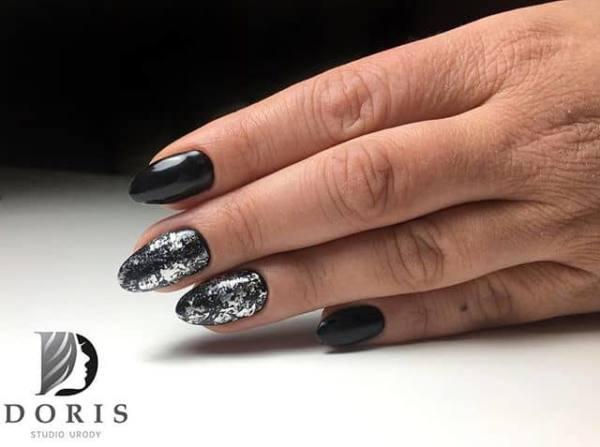 Este diseño de uñas utiliza un esmalte de uñas negro brillante como base principal para el diseño general, y en dos uñas por mano, hay una mezcla de esmalte metálico plateado que se rocía y gira sobre el negro brillante. Cada uña está redondeada en la punta, y la longitud puede ser determinada.