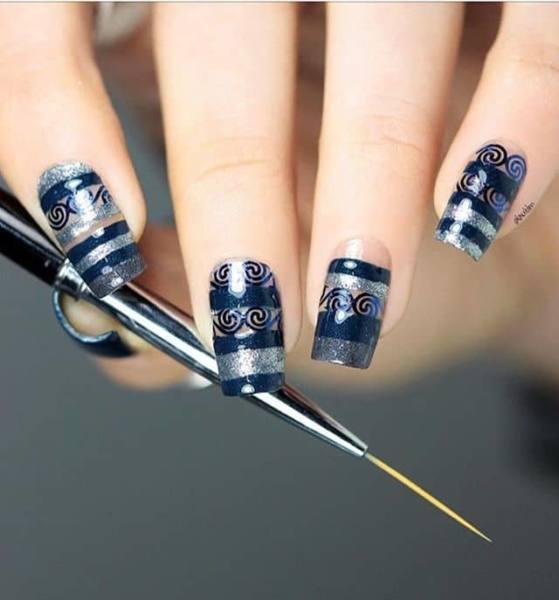 Esto utiliza un diseño de uñas de punta cuadrada, y utiliza un esmalte de uñas transparente como capa de base, mientras que cada uña se quita con una mezcla de esmalte de uñas azul oscuro y plata brillante. En cada uña, una sección tiene un hermoso diseño de remolino azul entre una de las rayas.