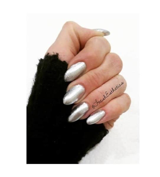 Este es un diseño clásico de uñas que utiliza un hermoso esmalte de uñas de brillo plateado. Este diseño puede ser usado para uñas largas o cortas, pero este diseño en particular tiene una sutil punta redonda, y puede ser usado para trajes diarios o para una noche especial en la ciudad. Da un lindo brillo y hará que tus uñas sean la comidilla de cualquier fiesta o conversación.