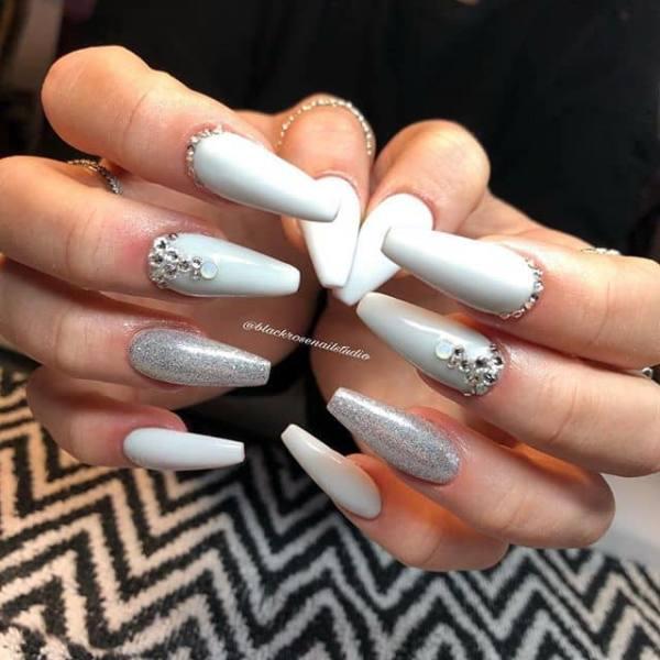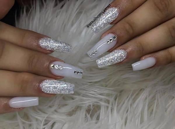El diseño está pensado para cortes de uñas más largos, y es sencillo ser creativo con el trabajo de las gemas para mostrar un poco de individualidad. Todas las uñas, excepto una en cada mano, están cubiertas con esmalte de uñas blanco sólido, mientras que las otras dos están cubiertas con un ligero esmalte de uñas plateado brillante. Dos de las uñas blancas de cada mano tienen algunas piedras preciosas colocadas en el esmalte blanco para el toque final de elegancia.