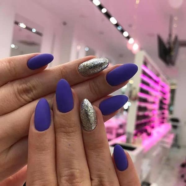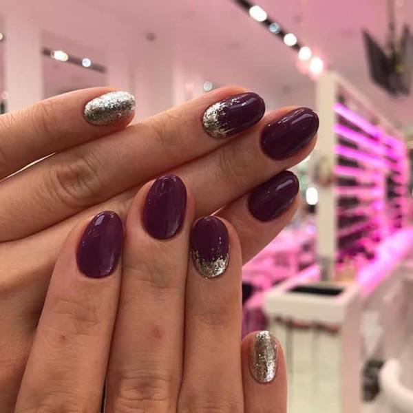 Este es un diseño de uñas único pero hermoso, que utiliza un púrpura oscuro como esmalte principal en cada uña, excepto en una. En cada mano, hay una sola uña pintada con esmalte de brillo plateado, lo que ayuda a añadir contraste al diseño, y aunque usa un corte redondo, podría ajustarse fácilmente a una punta cuadrada si lo desea. Lo mejor de estas uñas plateadas es que pueden ser usadas en casi cualquier ocasión.