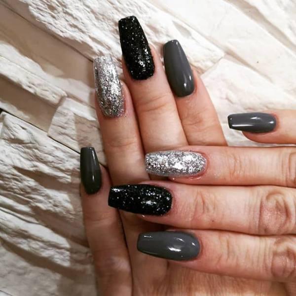 Las uñas negras pueden ser difíciles de arrancar, pero esta es una forma linda e impresionante que permitirá mostrar las uñas negras sin sentirse oscuro y sombrío. Están diseñadas con puntas cuadradas, y se utiliza un esmalte de brillo plateado brillante para añadir luz y contraste al diseño general de las uñas.
