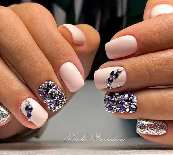 Este es un diseño de uñas más cortas, y utiliza una capa base de color rosa pálido claro, donde cada meñique se pinta con un esmalte de uñas de brillo plateado, y el dedo medio de cada mano está cubierto con plata y piedras preciosas púrpuras. Otras dos uñas tienen una pequeña línea de piedras preciosas que la hacen perfecta para todo tipo de ocasiones, sin dejar de ser práctica para un día en la oficina.
