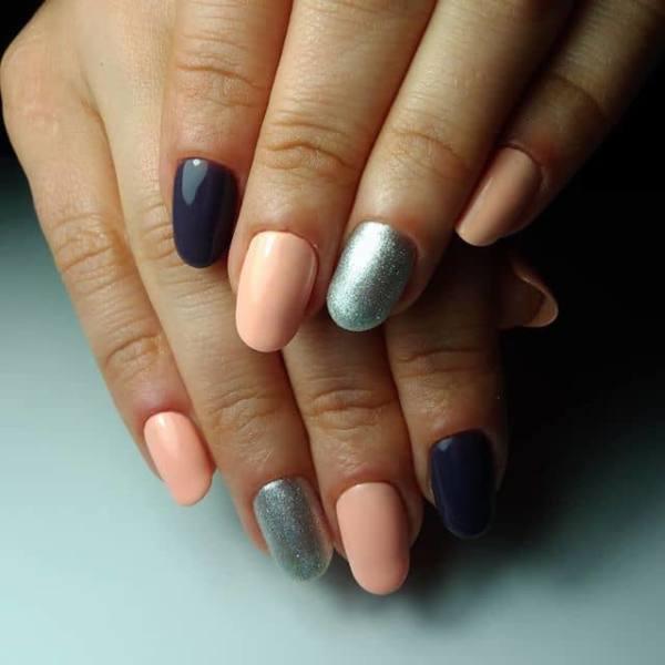 Este es un diseño simplista que utiliza tres colores generales en un patrón alternativo, y cada mano tendrá diferentes dedos pintados con esmalte de uñas rosa pálido, un esmalte de uñas púrpura oscuro brillante y esmalte de uñas plateado brillante. También es un diseño práctico que puede ser usado en el trabajo, porque la longitud de las uñas puede ser alterada, como se desee.