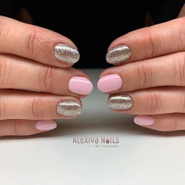 Este es un diseño de uñas elegante y divertido que es fácil de duplicar y puede ser usado en varias ocasiones. Esto utiliza un diseño de uñas alternativo con dos patrones diferentes. Uno de los patrones es un esmalte de uñas de brillo plateado recto, y las otras uñas están pintadas con un esmalte plateado claro desde el cubículo hasta la uña media, y desde la uña media hacia arriba, utiliza un esmalte de color rosa claro. Utiliza puntas redondas, y es un diseño de uñas más cortas que es a la vez hermoso y práctico para el uso diario u ocasiones especiales.