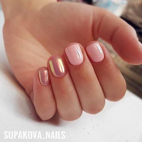 Este diseño presenta un giro en la clásica manicura brillante rosa nudista. El artista ha colocado fragmentos de un material iridiscente en la parte superior, cubriéndolo con una capa superior. Esto aporta dimensión y movimiento al diseño de la uña, evitando que el rosa pálido se vuelva aburrido y exagerado. Este diseño tiene mucha imaginación.
