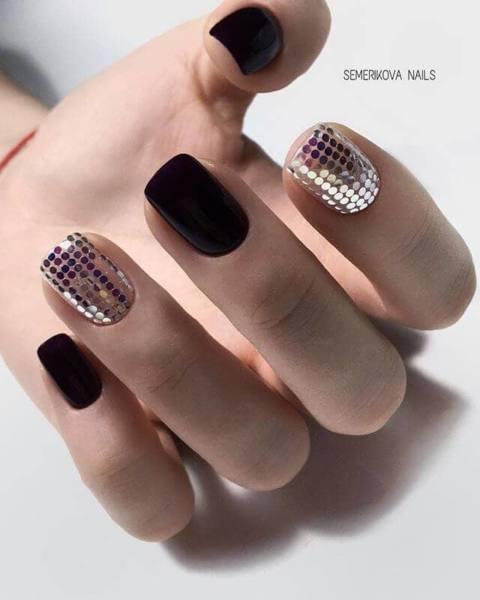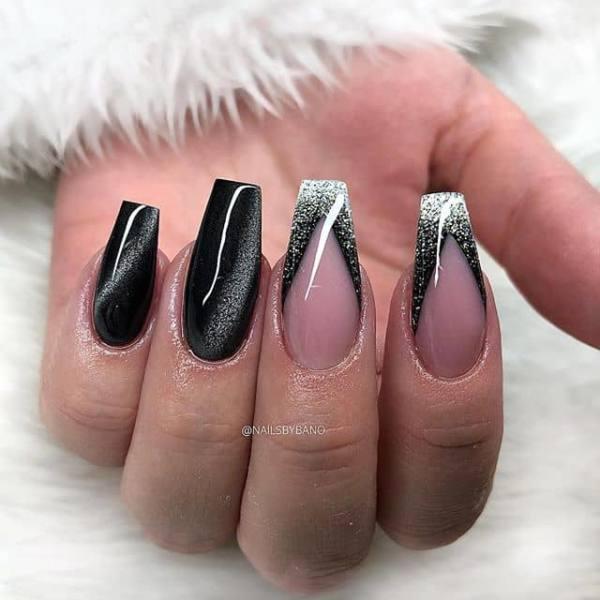 Este diseño único de uñas negras salpica los trajes para ocasiones especiales. Estas uñas de diseño combinan el negro mate con una uña translúcida de acento desnudo. En las uñas de acento, añade filas de espejos brillantes. Estas uñas evocan el glamour de las noches en el club sin ser demasiado difíciles. Estas uñas combinan perfectamente con cualquier ropa para una noche de diversión.