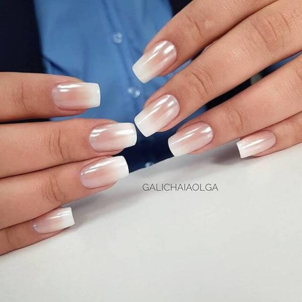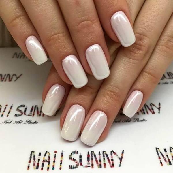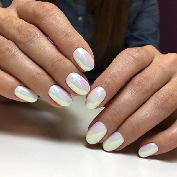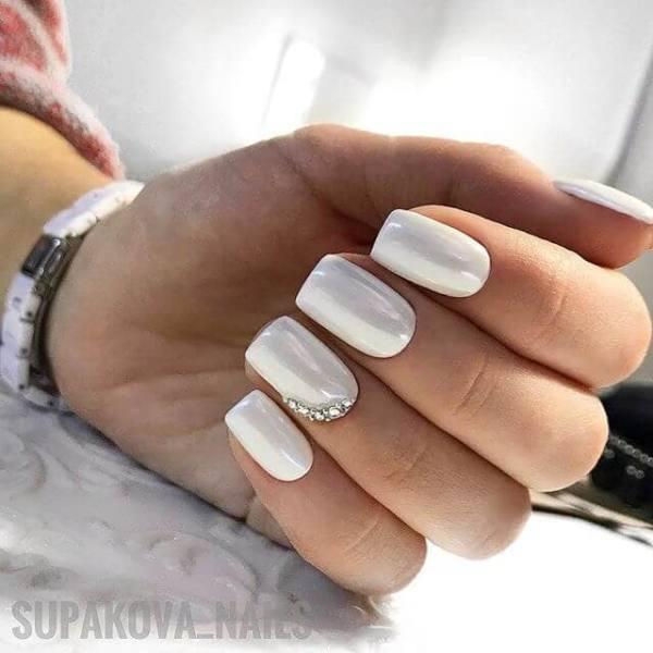 Estas lindas y elegantes uñas muestran la belleza del pulido blanco iridiscente. Usado en una uña corta y redondeada, este esmalte refleja la luz y atrae la atención hacia las manos. Este diseño estaría bien con un traje más elaborado para proporcionar un contraste discreto. Use estas uñas cuando quiera brillar.
