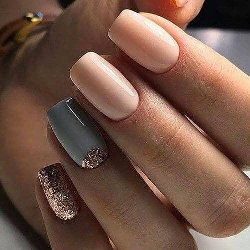 Estas uñas únicas combinan un color de uña brillante rosa pálido con un color de acento gris. Una uña tiene un diseño francés y las más pequeñas son las uñas metálicas. El diseño fluye muy bien desde el pulido rosa pálido brillante a los acentos metálicos. Pruebe estas uñas con un sutil traje de color crema o vaya por el contraste y use el negro.