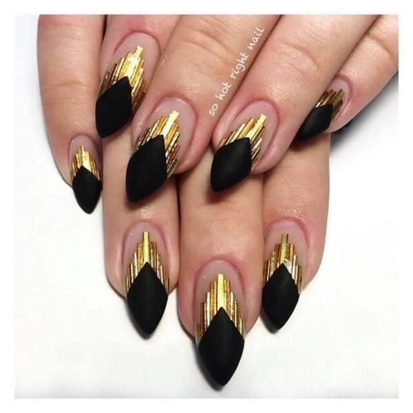 Este diseño de uñas negras es el mejor para aquellos que quieren causar una impresión única. Las puntas puntiagudas se emparejan con las uñas mate. Los acentos dorados se pegan en un arreglo que recuerda al art decó. Estas uñas pueden no ser las más prácticas, pero sin duda te harán destacar entre la multitud. Son perfectas para que las use cualquier adicto a las uñas.