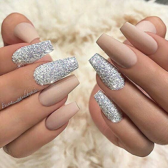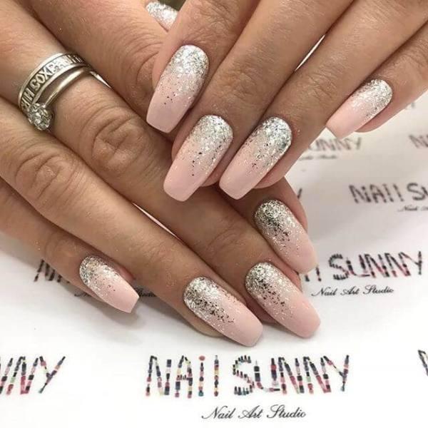 Estas populares uñas tienen un acabado caprichoso que le da glamour a cualquier ropa. El esmalte de uñas rosa está cubierto con brillo plateado en un estilo ombre. Este es un diseño de uñas largas que sería bonito para cualquiera. Pruébalo en un color pastel diferente para que combine o contraste con tu ropa. Intenta usar estas uñas para cualquier ocasión especial. Combina con las uñas de los pies para lograr un efecto impresionante.