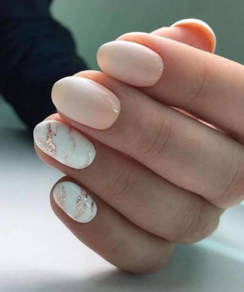 Este impresionante diseño de arte de uñas proporciona un sutil acento metálico a cualquier conjunto. Un diseño de uñas desnudas brillantes se combina con el blanco cremoso. A través de las uñas blancas, se pinta el esmalte metálico rosa dorado para que parezca mármol natural. Este diseño de uñas es simple y creativo. Cualquiera debería ser capaz de recrear este diseño en casa.