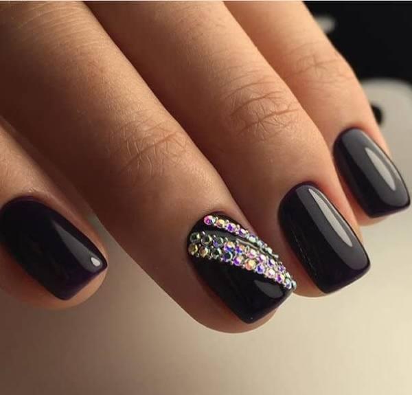 Las uñas oscuras proporcionan un fondo elegante para hermosos adornos de cristal. Los cristales brillan en diferentes colores pastel. Se colocan en diagonal a través de las uñas para maximizar el brillo. Las uñas negras brillantes tienen marcas de brillo en un color gris medio. Apenas se necesitan con el impresionante brillo de esta manicura.