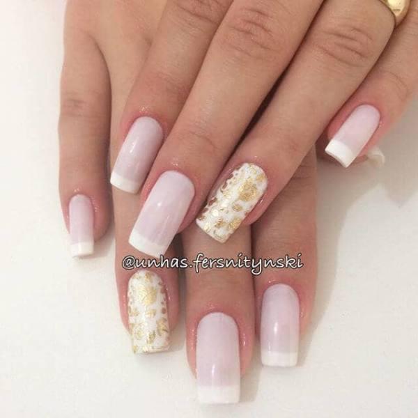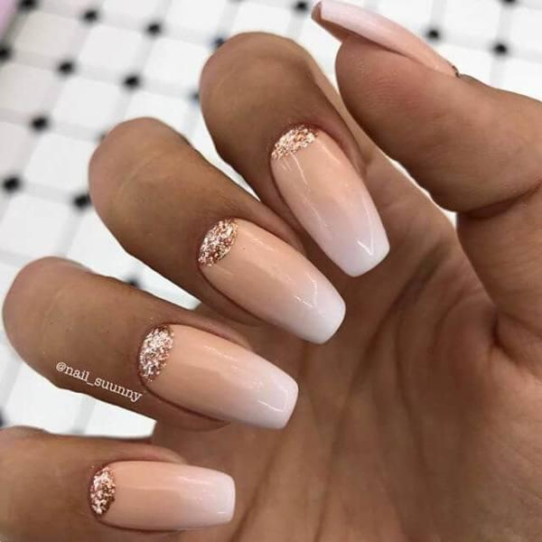 Este bonito diseño de ombre rosado y blanco se combina con un encantador brillo de oro rosa sobre la media luna. El color rosa y el efecto del ombre son sutiles. Estas uñas serían perfectas en cualquier color, pero el rosa tiene un atractivo especial para todos los amantes del arte de las uñas. Estas uñas tienen las puntas cuadradas para un aspecto único.
