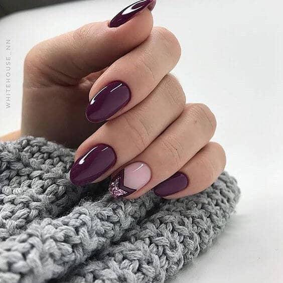 Estos destacados diseños de arte de uñas causan una gran impresión. El color profundo de las uñas de color vino realza el color rosa pálido del dedo anular. Un diseño en forma de chevrón está pintado en la uña con el púrpura oscuro, y el brillo rosa claro lo llena. Estas son uñas espectaculares, pero el perfil de color mantiene el aspecto profesional. Cualquiera podría usar estas uñas, de día o de noche.