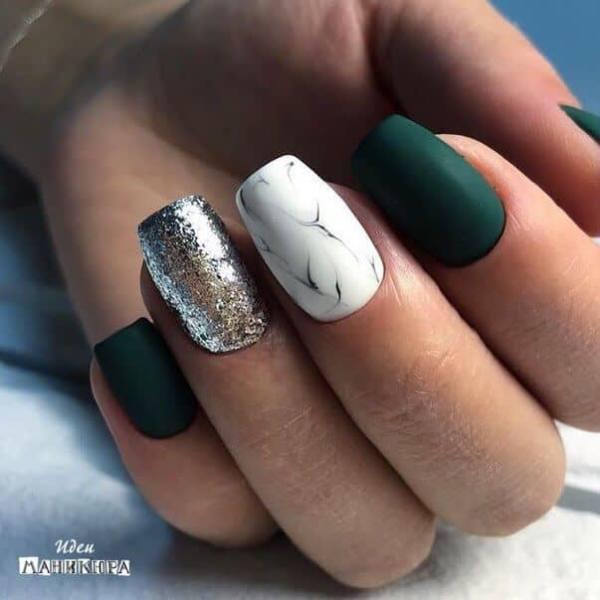El arte de la cerceta y las uñas verdes están de moda este año. Esta bonita idea del esmalte de uñas combina un color tenue pero precioso con una silueta de uñas clásica. Cuadradas y cortas, estas uñas geniales son prácticas para que cualquiera las use. El color cerceta va bien con los trajes negros, grises y caqui. Pruébalo con un traje de trabajo para un toque individual extravagante.