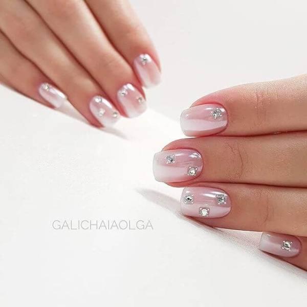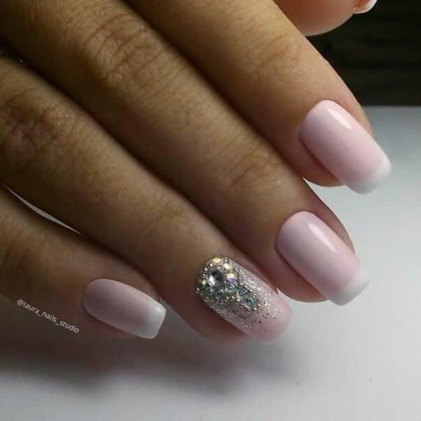 Este diseño comienza con una manicura francesa clásica de color rosa pálido con puntas blancas. La tercera uña está pintada de rosa pálido por todas partes y luego se cubre con gemas. Los cristales de diferentes tamaños están dispuestos de forma graduada, dando un efecto casi ombre en las uñas. Alrededor de los bordes del diseño hay un anillo de brillo de plata. Este diseño es muy intrincado y difícil de lograr. El tiempo y la paciencia necesarios para colocar correctamente los cristales vale la pena cuando se reciben merecidos elogios.